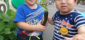 自分たちで育てたきゅうりを握りしめ、