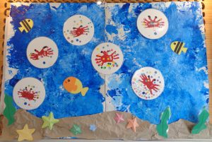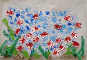 ホーム ブログ一覧 7月壁面 7月壁面 こころ保育園 2025.08.06 7月もとっても暑い日が続きましたね。 子どもたちは毎日のプールを楽しんでいます。 7月の壁面は各学年、涼しそうな壁面でした。 【0歳児】 海の中で泳ぐ、お魚たちはみんなの手形。 広い海の中で楽しそう~? 【1歳児】 涼しそうな風鈴~♪ 風が吹くと音がなるよ~!綺麗な飾りつけを楽しんでいました。 【2歳児】 手形のカニでうちわを作りました。 キラキラシールを貼って可愛いうちわが出来ました。 ブログ一覧に戻る