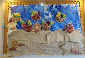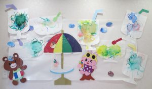 ホーム ブログ一覧 8月壁面 8月壁面 こころ保育園 2025.08.21 毎日、子どもたちはプール遊びを楽しんでいます。 1歳 【1歳児】 暑い夏にぴったり合いそうな爽やかなジュース🍹 画用紙に描いてにじみ絵をしました。沢山の色が混ざり、美味しそうですね~! 【2歳児】 夏野菜の収穫で、沢山の野菜を知ることが出来ました。 ビニールの中に野菜の色のお花紙を入れて完成~✨ トマト・きゅうり・トウモロコシ・なすび 美味しそうな野菜を手作りバスケットに入れました🧺 ブログ一覧に戻る