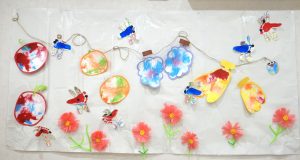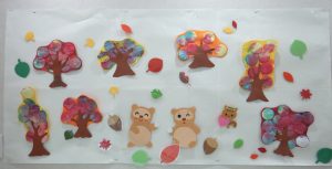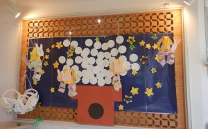 ホーム ブログ一覧 9月壁面 9月壁面 こころ保育園 2025.09.08 9月と言うのにまだまだ暑い日が続きますね。 【0歳児】 足形のトンボは、シールで目を張り、羽はビー玉転がしで模様を付けました✨ 秋のフルーツは袋の中に画用紙と絵具を入れフィンガーペインティングで完成です! 【1歳児】 秋の木をイメージして、コットンに筆で絵具を染み込ませました? 筆をコットンの上の置くとジワジワと絵具が広がり、絵具の広がりを楽しんでいました? 【2歳児】 みんなで大きなお月見団子を作りました? 今回は立体にお月様から見ているウサギさん?です! ブログ一覧に戻る
