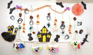 ホーム ブログ一覧 10月壁面 10月壁面 こころ保育園 2025.10.30 10月になり壁面も一気にハロウィンになりました。 【0歳児】 手形と拳の型を取り、ハロウィンの世界に仕上がったかわいい壁面です。 ハロウィンパーティーで使うカバンも一緒に壁面にしてみました。 【1歳児】 タンポでたくさんおばけの体を表現? 帽子・目・口を貼り完成~! 【2歳児】 フェルトボールに絵具を染み込ませて、 手のひらで叩くと、絵具が飛び散りいろんな形のモンスターに!! カラフルで可愛いモンスターがたくさん!!! 目や、牙もつけると色々なモンスターが産まれました✨ ブログ一覧に戻る