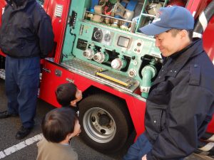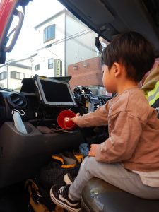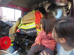 間近で見る消防車に興味津々の子ども達。2歳さんは消防士さんにずっと質問攻め☺︎