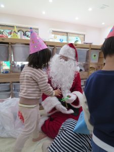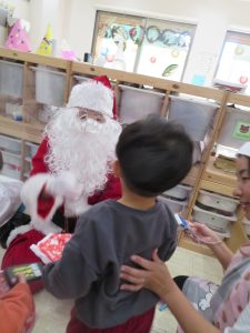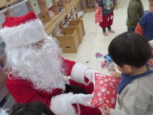 ビックリして保育者にしがみつく子もいましたが、プレゼントは
