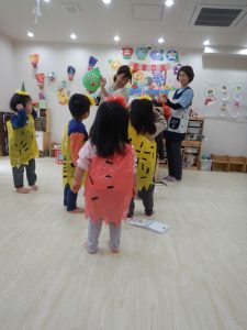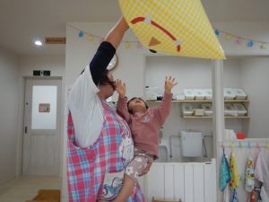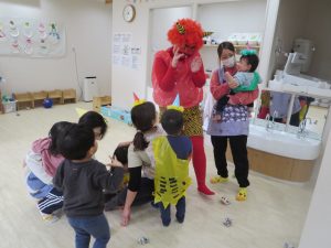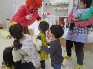 可愛い風船オニでしたが、初めはドキドキな様子の0、1歳さん。
