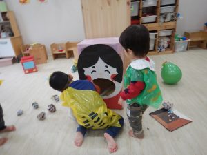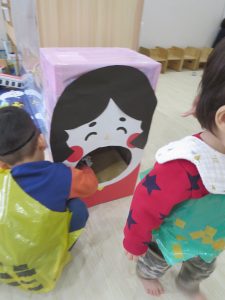2歳児は大喜び!テンション高く豆を投げて遊んでいるところにインターホンが鳴ってオニ登場にビックリする子ども達。