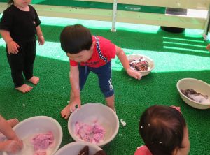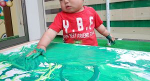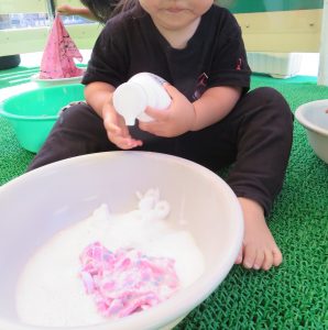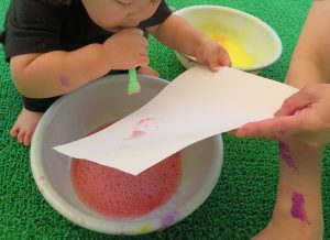 泡の中に絵具を混ぜて、ゴシゴシしたり・・・