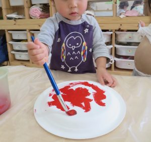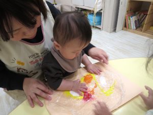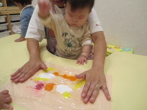 まだまだお口になんでも入れてしまうので、今回はラップの上から絵具をグニュグニュと押してみました。