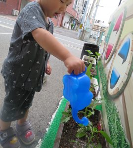 水やりも忘れず、2歳児クラスのにじぐみさんが、お当番でしてくれています。