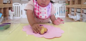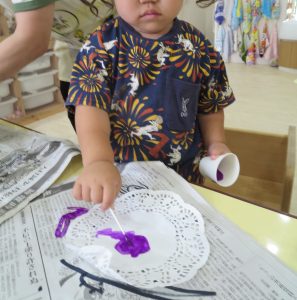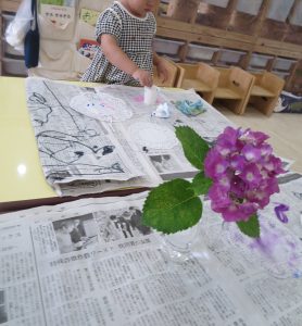 本物のあじさいの花を見てお花をイメージしながら綿棒でスタンピング!