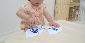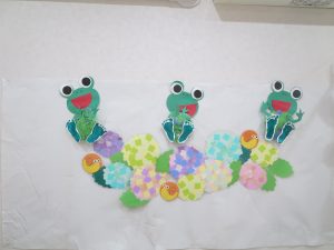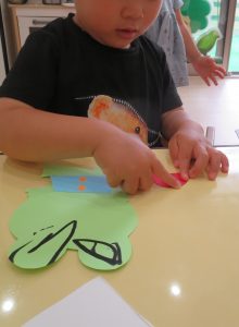 カエルの製作はのりも使い、カエルの顔を完成させました。