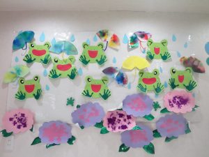 雨の中で傘をさして楽しそうなカエルたちですね!