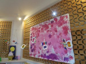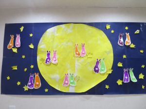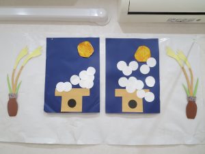 ホーム ブログ一覧 9月10月壁面 9月10月壁面 こころ保育園 2024.11.29 0歳児壁面 お団子をペタペタとはり、ぬたくりをしたお月様を貼って完成~!! 1歳児壁面 大きなお月様はみんなでの共同作品! 足形をかわいいウサギに見立てて、2匹並んでのお月見? 2歳壁面 みんなでコスモス畑を作り、そこに自由に飛びまわるトンボたち。 好きな色眼鏡を選んでトンボを完成させてくれましたよ! ブログ一覧に戻る