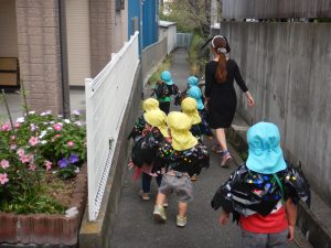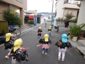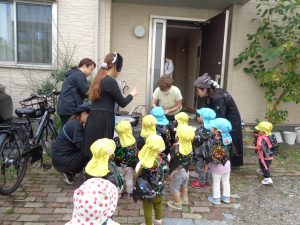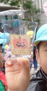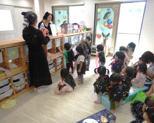 保育園に食いしん坊のおばけの子 ‟べーちゃん”が遊びに来てくれました。なんでも食べちゃうので、みんなのプレゼントまでペロリと食べて隠してしまいました。